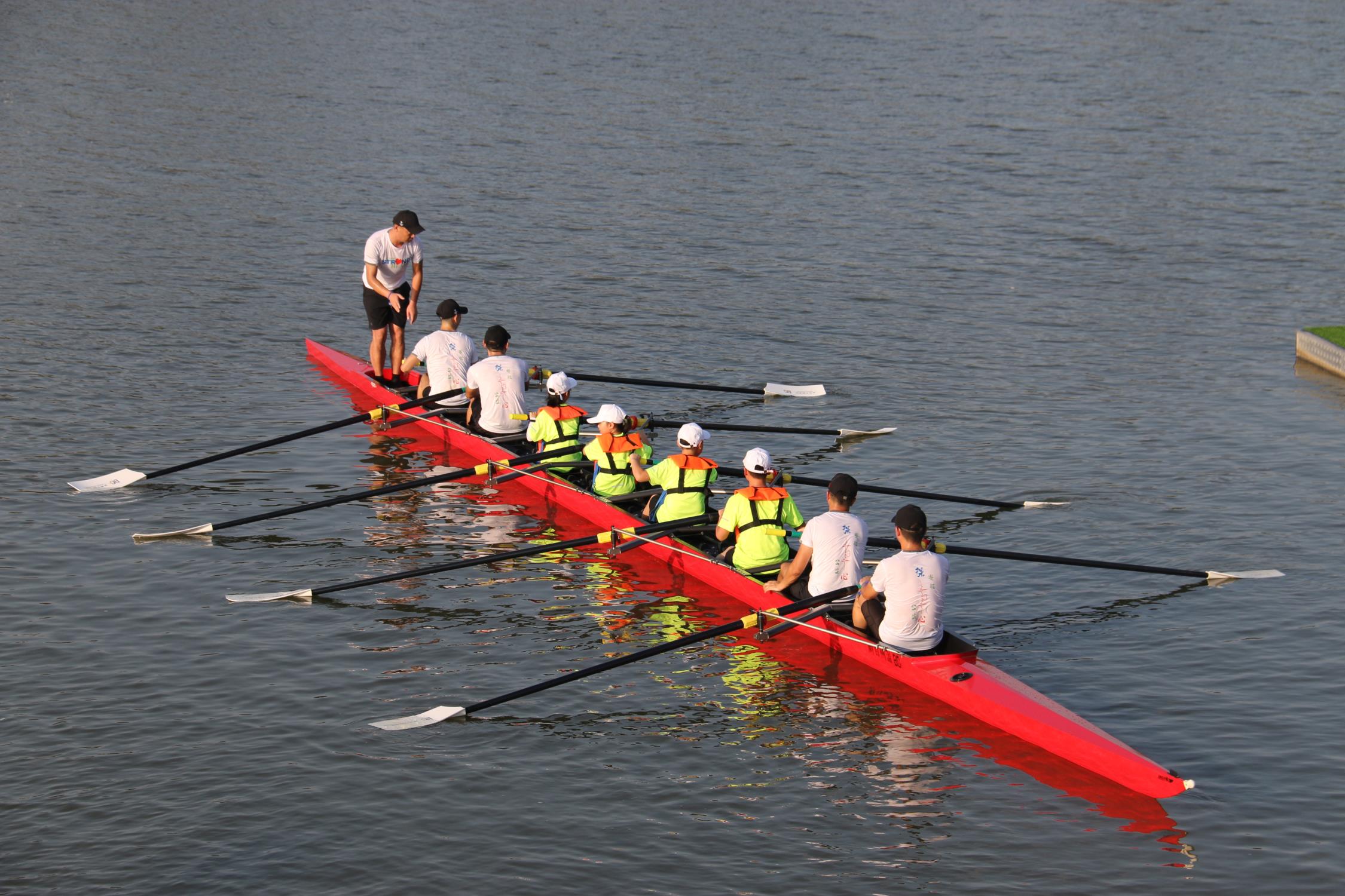 在杭州強心賽艇隊的熱烈歡迎下,本次城際賽艇交流活動拉開序幕。熱身運動后,百盛青年隊與杭州強心賽艇隊奉獻了一場精彩的八人制賽艇表演賽。整齊如一的劃槳、奮勇爭先的吶喊聲,展現了百盛人堅毅果敢的拼搏精神,讓參與人員深刻地感受到了賽艇運動的魅力與激情。賽后,百盛青年隊和少年隊隊員分批接受強心隊“老師”們的指導和水上實操訓練。在經過一番教導后,隊員學到了不少干貨,受益匪淺。