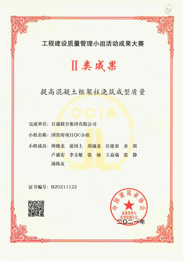 10月25日,百盛聯合集團有限公司一項QC成果《提高混凝土框架柱澆筑成型質量》憑借科學嚴謹的內容編制、極具推廣應用的技術價值,經過多級競賽和評審,獲評全國工程建設質量管理小組二類成果獎。