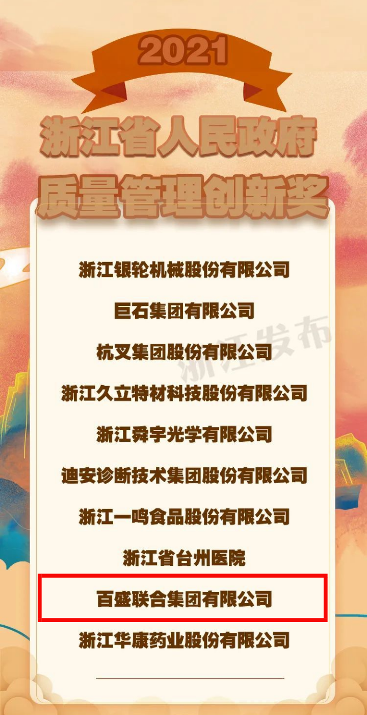 浙江省人民政府質(zhì)量獎(jiǎng)是省政府設(shè)立的全省最高質(zhì)量獎(jiǎng)項(xiàng),是對(duì)從事產(chǎn)品生產(chǎn)、工程建設(shè)、服務(wù)提供、環(huán)境保護(hù)的組織實(shí)施卓越績(jī)效管理、取得顯著經(jīng)濟(jì)效益和社會(huì)效益的獎(jiǎng)勵(lì)。經(jīng)過(guò)嚴(yán)格的資料評(píng)審、現(xiàn)場(chǎng)評(píng)審、顧客滿意度調(diào)查及陳述答辯等環(huán)節(jié),百盛聯(lián)合集團(tuán)最終從百余家申報(bào)企業(yè)中脫穎而出,獲得此項(xiàng)殊榮,繼2017年榮獲龍灣區(qū)區(qū)長(zhǎng)質(zhì)量獎(jiǎng)、2020年獲溫州市市長(zhǎng)質(zhì)量獎(jiǎng)后,又喜獲2021年度浙江省人民政府質(zhì)量管理創(chuàng)新獎(jiǎng)。