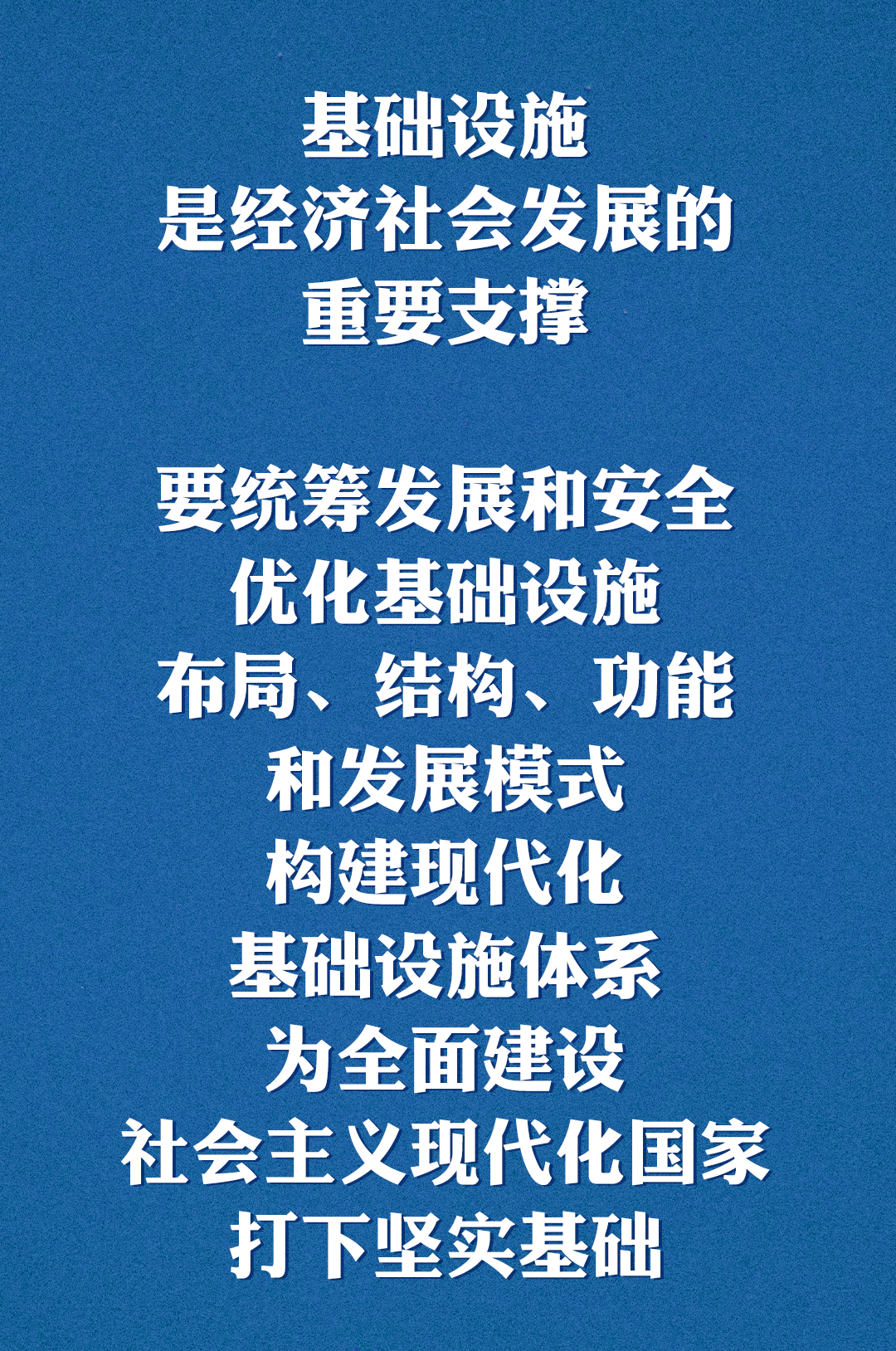 當前和今后一個時期,要堅持以人民為中心的發展思想,堅持問題導向、目標導向,統籌發展和安全,系統謀劃、整體協同,精準補短板、強弱項,優化基礎設施布局、結構、功能和發展模式,調動全社會力量,構建現代化基礎設施體系,實現經濟效益、社會效益、生態效益、安全效益相統一,服務國家重大戰略,支持經濟社會發展,為全面建設社會主義現代化國家打下堅實基礎。