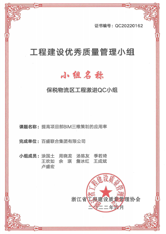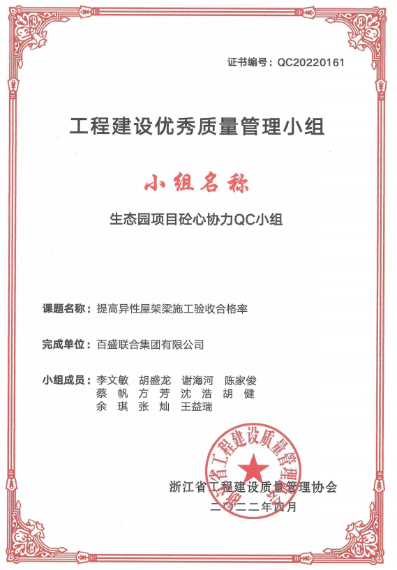4月,浙江省工程建設質量管理協會2022年度QC成果會以網絡會議形式舉辦。百盛聯合集團的《提高異型屋架梁施工驗收合格率》、《提高圓柱混凝土定型化木模應用質量》、《提高項目部BIM三維策劃的應用率》課題,獲得了評審專家們的認可,取得優秀質量管理小組稱號。