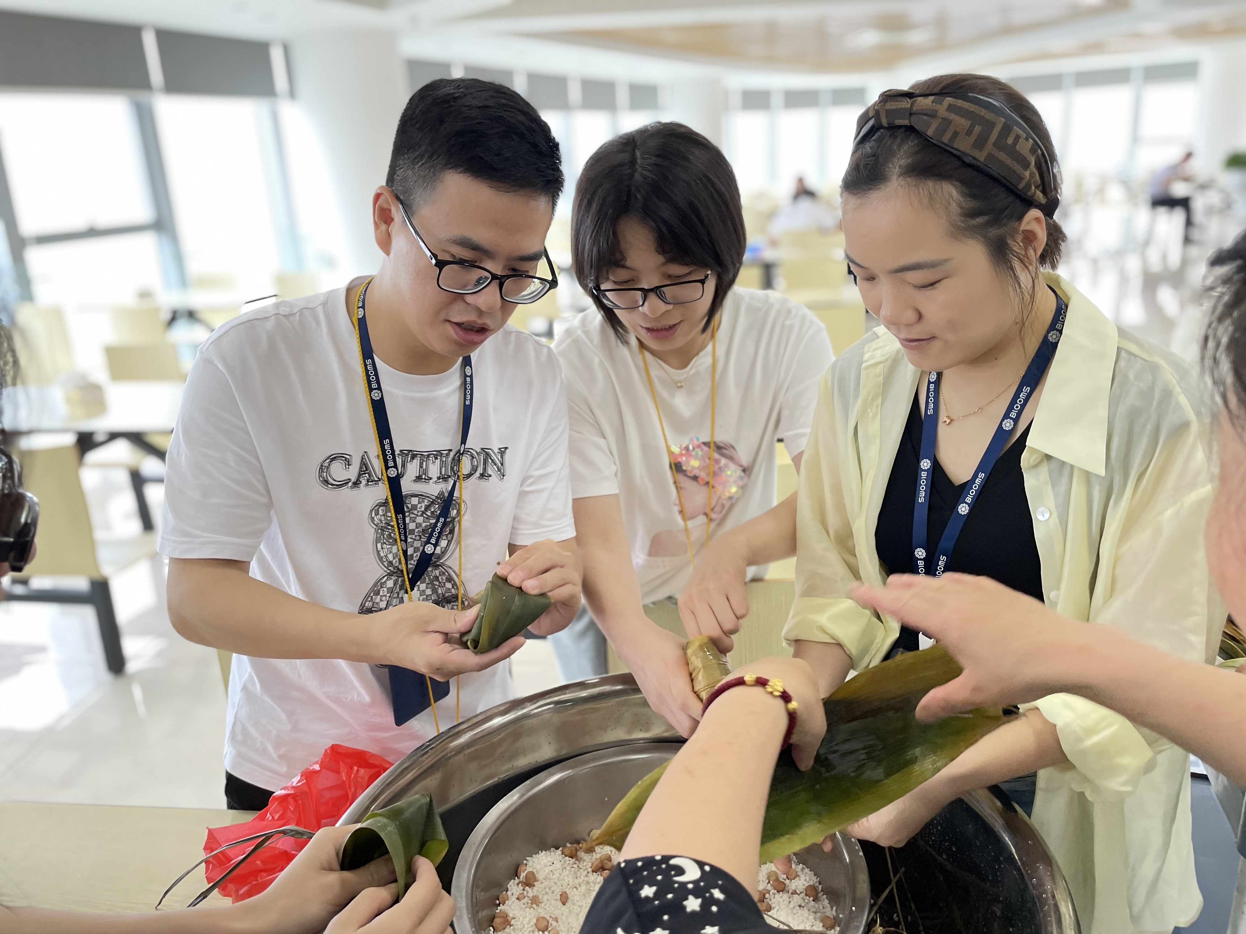 過(guò)端午節(jié),包粽子和劃龍舟是必不可少的項(xiàng)目。工作人員準(zhǔn)備了糯米、粽葉、蜜棗、花生等材料。員工們圍繞著餐桌,把粽葉卷成漏斗狀,填進(jìn)糯米和餡料,用粽葉蓋緊后,再用細(xì)繩一纏一系。一張張翠綠的粽葉在手中不斷得旋轉(zhuǎn)和折疊,粽子“作品”一個(gè)接一個(gè)地誕生。