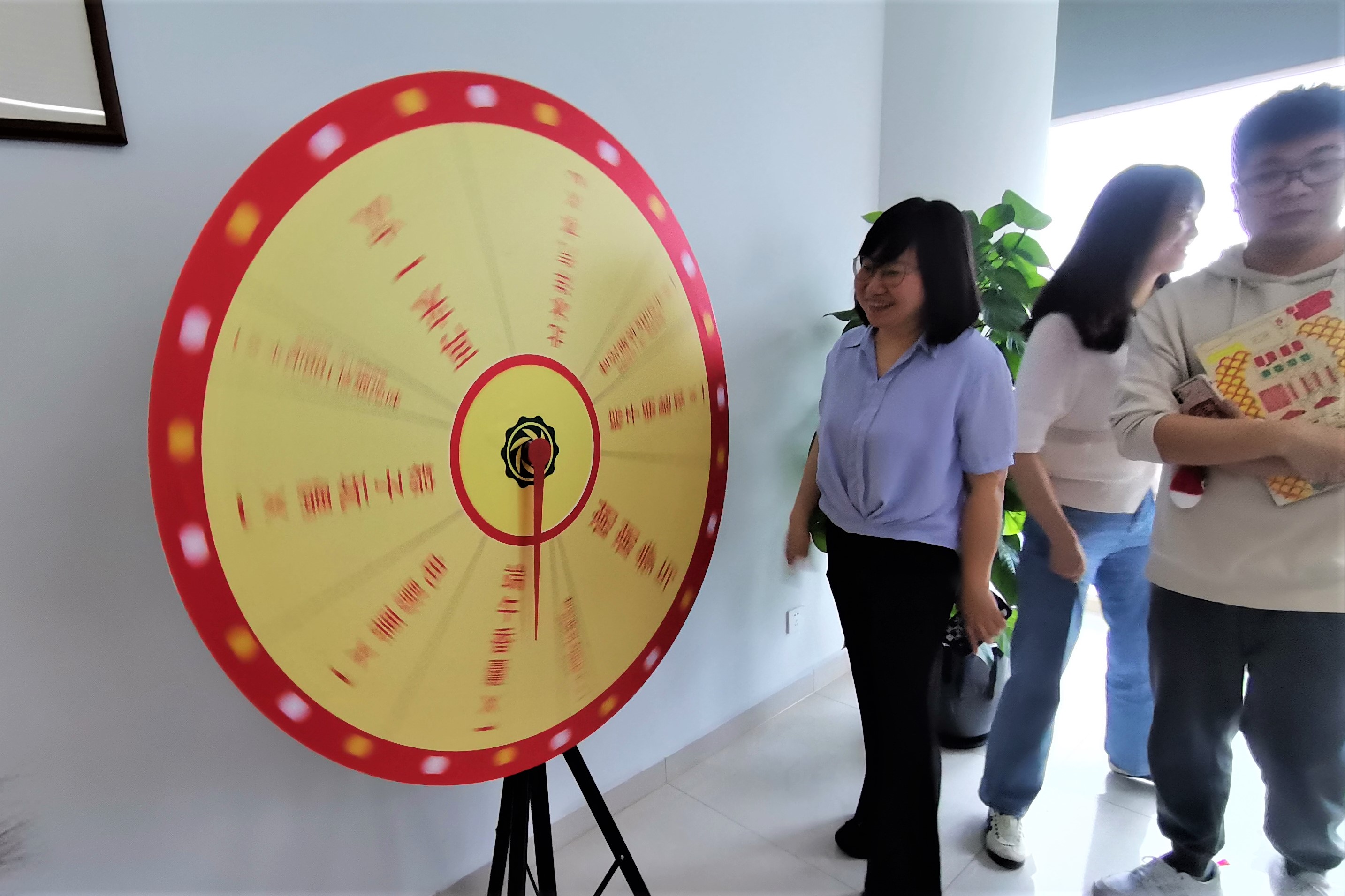 “粽享幸運(yùn)”是通過(guò)轉(zhuǎn)大轉(zhuǎn)盤(pán)轉(zhuǎn)出一份禮物,轉(zhuǎn)出一份幸運(yùn)。轉(zhuǎn)盤(pán)上劃著不等分的8份獎(jiǎng)品,每人都想轉(zhuǎn)到心中的幸運(yùn)大獎(jiǎng)。隨著轉(zhuǎn)盤(pán)的慢慢停止或者回轉(zhuǎn),吸引了在場(chǎng)所有人的目光。活動(dòng)現(xiàn)場(chǎng)其樂(lè)融融,歡聲笑語(yǔ),彌漫著濃濃的節(jié)日氛圍。