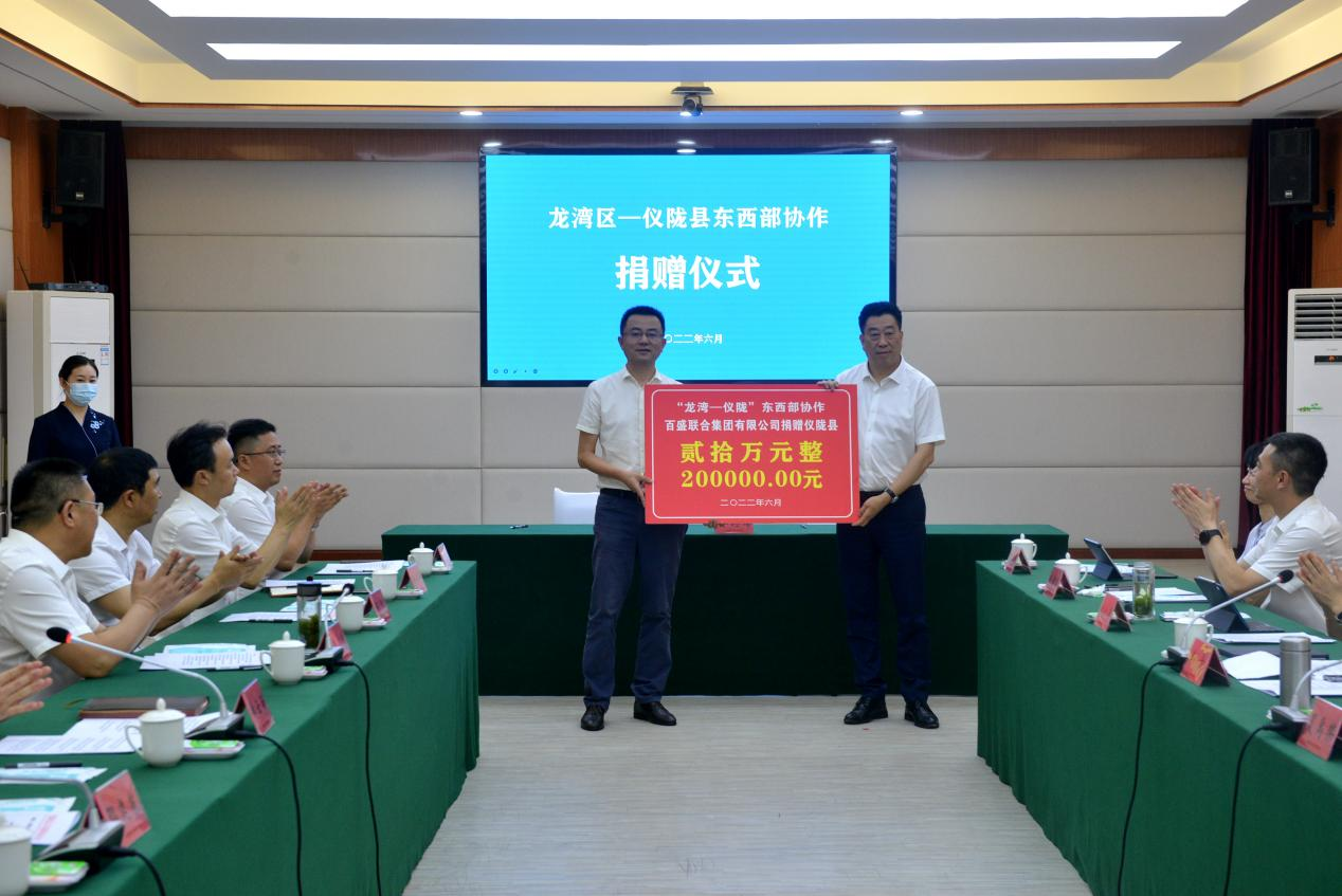 6月25日,龍灣區-儀隴縣東西部協作工作聯席會議在儀隴縣行政中心舉行。會議過程中,還舉行了龍灣區-儀隴縣東西部協作捐贈儀式。百盛聯合集團有限公司總裁盛星樂代表集團向當地捐贈20萬元。