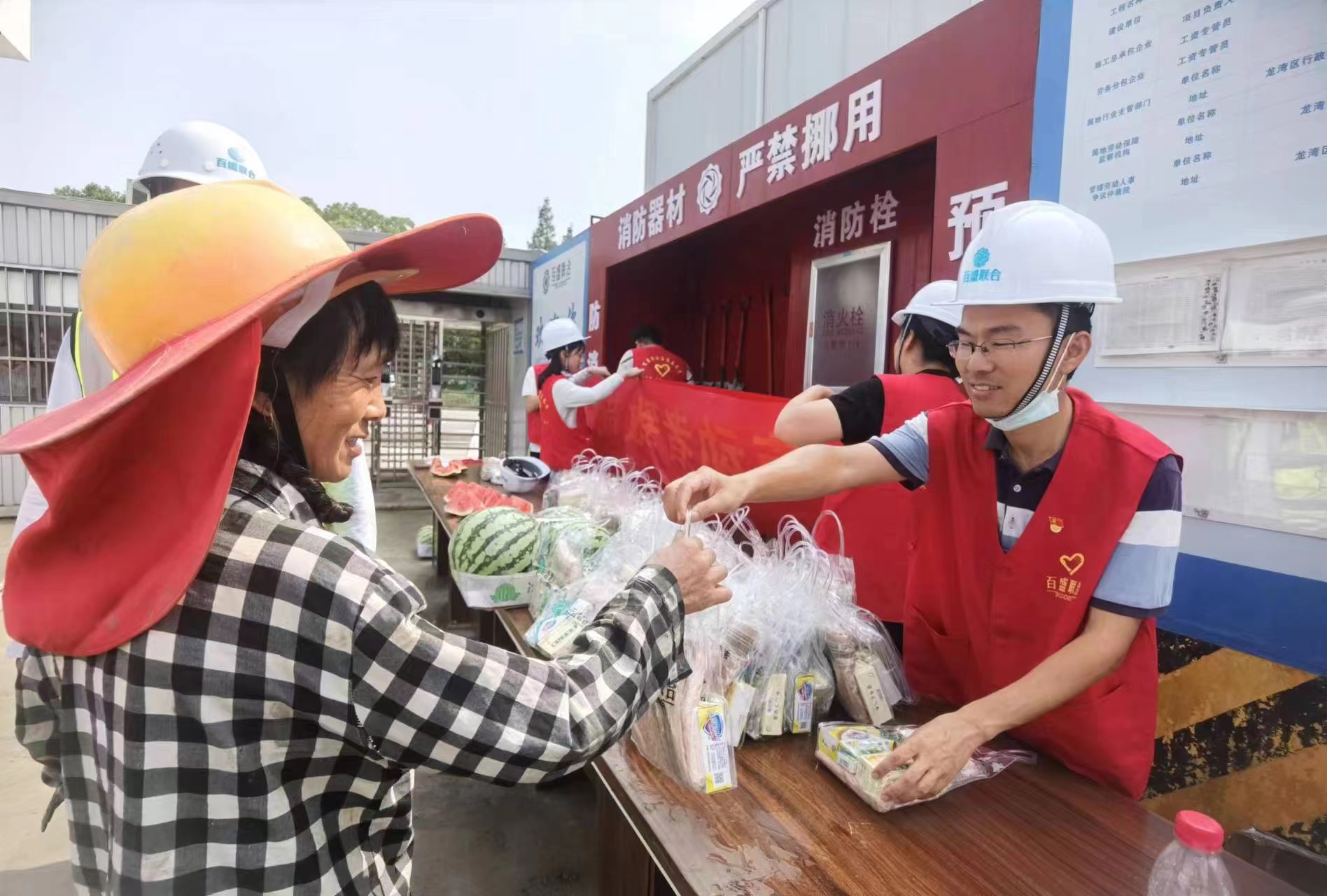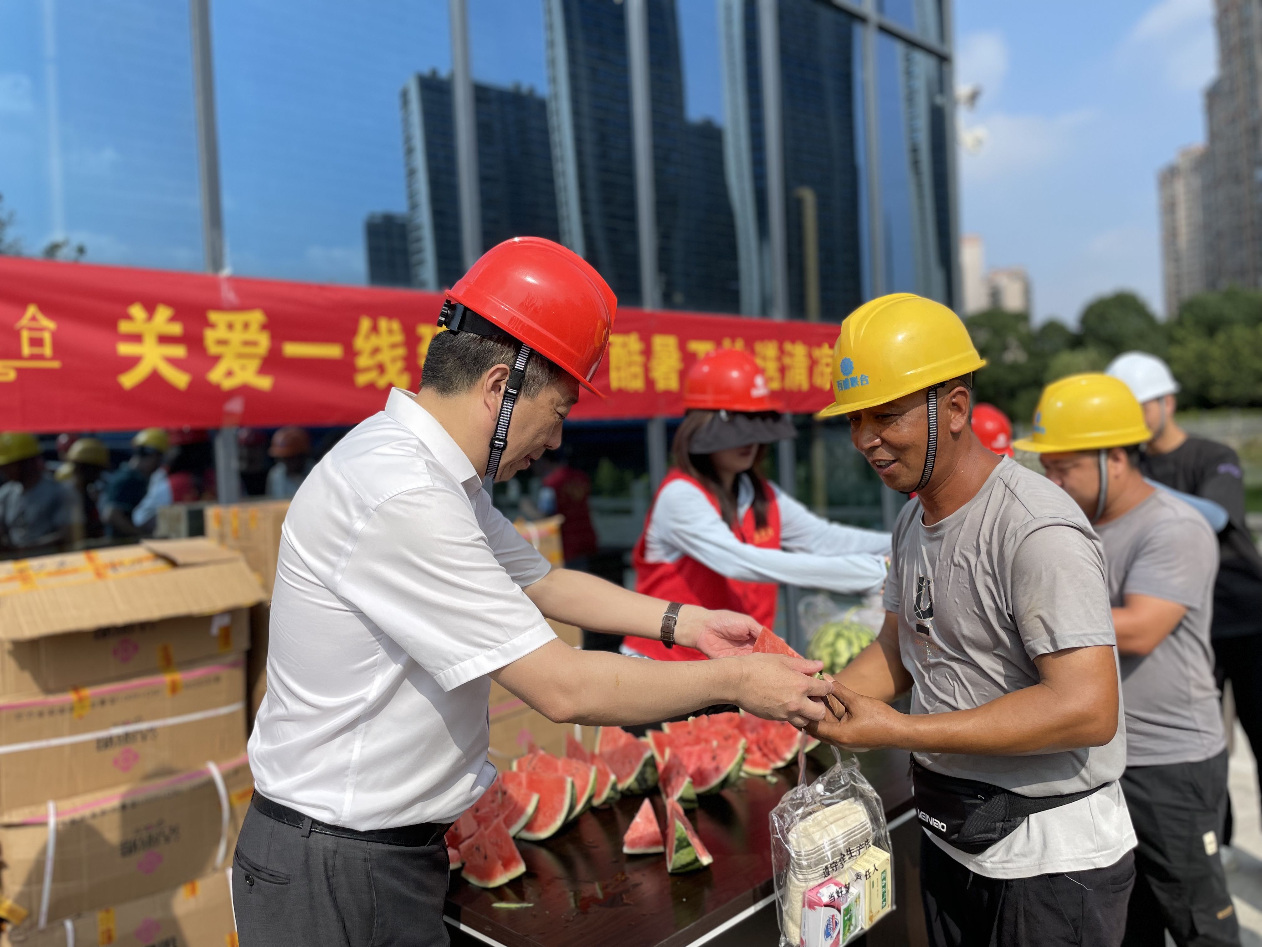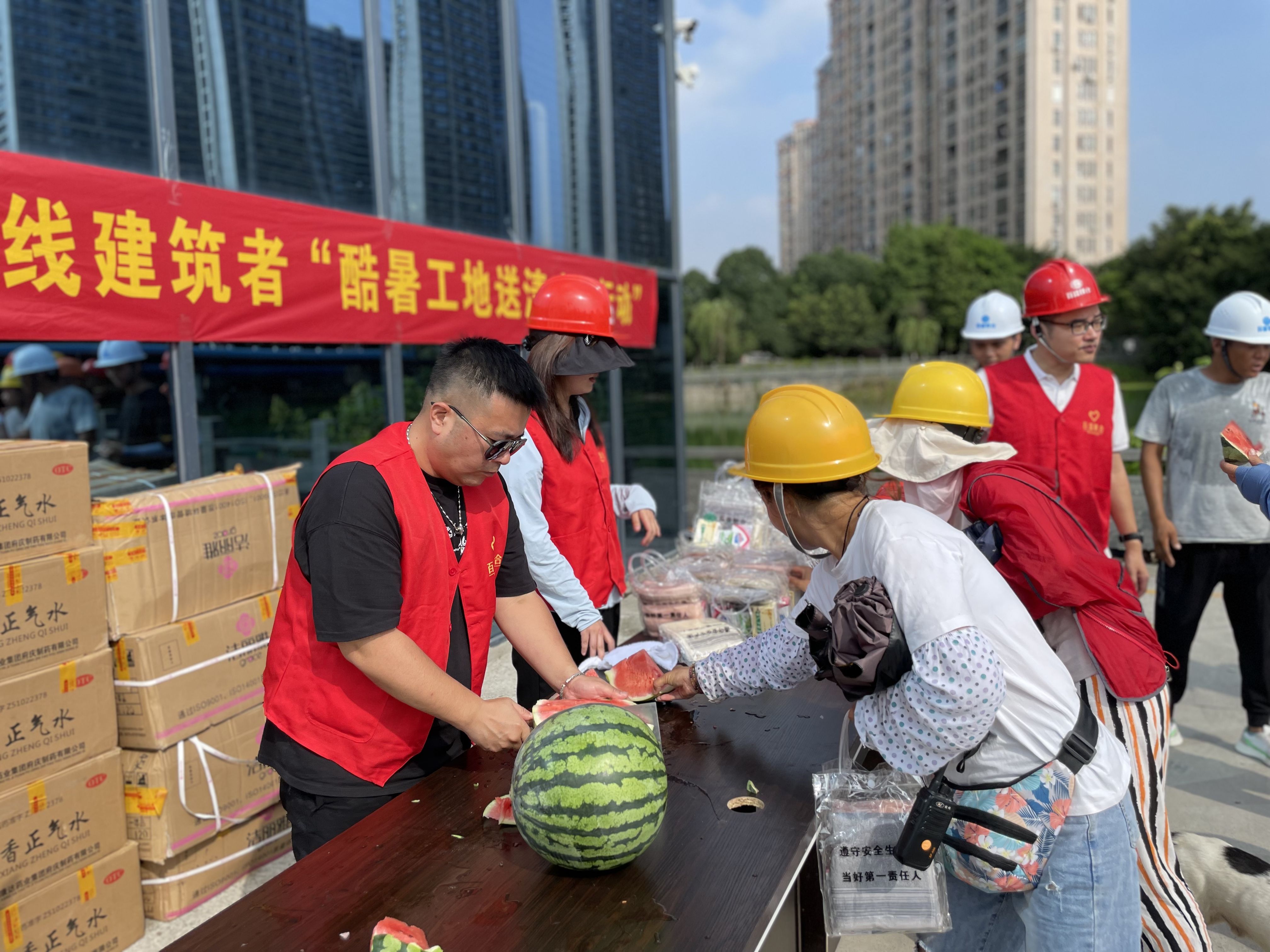 在蒲州街道嶼田村城中村改造項目和永強北片區龍水單元項目現場,集團董事長盛星樂與工作人員一道,為一線職工送去礦泉水、藿香正氣水、龍虎人丹、西瓜等降溫用品。同時,對所有戰高溫、冒酷暑、保建設的工作者表示感謝,并叮囑他們要注意自身健康和安全,做好高溫防暑防護。