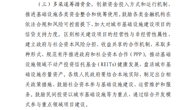 在保障措施方面,《規(guī)劃》提出,要多渠道籌措資金。創(chuàng)新資金投入方式和運(yùn)行機(jī)制,推進(jìn)基礎(chǔ)設(shè)施各類資金整合和統(tǒng)籌使用。鼓勵(lì)各類金融機(jī)構(gòu)在依法合規(guī)和風(fēng)險(xiǎn)可控前提下,加大對(duì)城市基礎(chǔ)設(shè)施建設(shè)項(xiàng)目的信貸支持力度。區(qū)別相關(guān)建設(shè)項(xiàng)目的經(jīng)營(yíng)性與非經(jīng)營(yíng)性屬性,建立政府與社會(huì)資本風(fēng)險(xiǎn)分擔(dān)、收益共享的合作機(jī)制,采取多種形式,規(guī)范有序推進(jìn)政府和社會(huì)資本合作(PPP)。推動(dòng)基礎(chǔ)設(shè)施領(lǐng)域不動(dòng)產(chǎn)投資信托基金(REITs)健康發(fā)展,盤(pán)活城市基礎(chǔ)設(shè)施存量資產(chǎn)。各級(jí)人民政府要結(jié)合本地實(shí)際,制定出臺(tái)相關(guān)政策措施,鼓勵(lì)社會(huì)資本參與基礎(chǔ)設(shè)施建設(shè)、運(yùn)營(yíng)維護(hù)和服務(wù)。鼓勵(lì)民間投資以城市基礎(chǔ)設(shè)施等為重點(diǎn),通過(guò)綜合開(kāi)發(fā)模式參與重點(diǎn)領(lǐng)域項(xiàng)目建設(shè)。