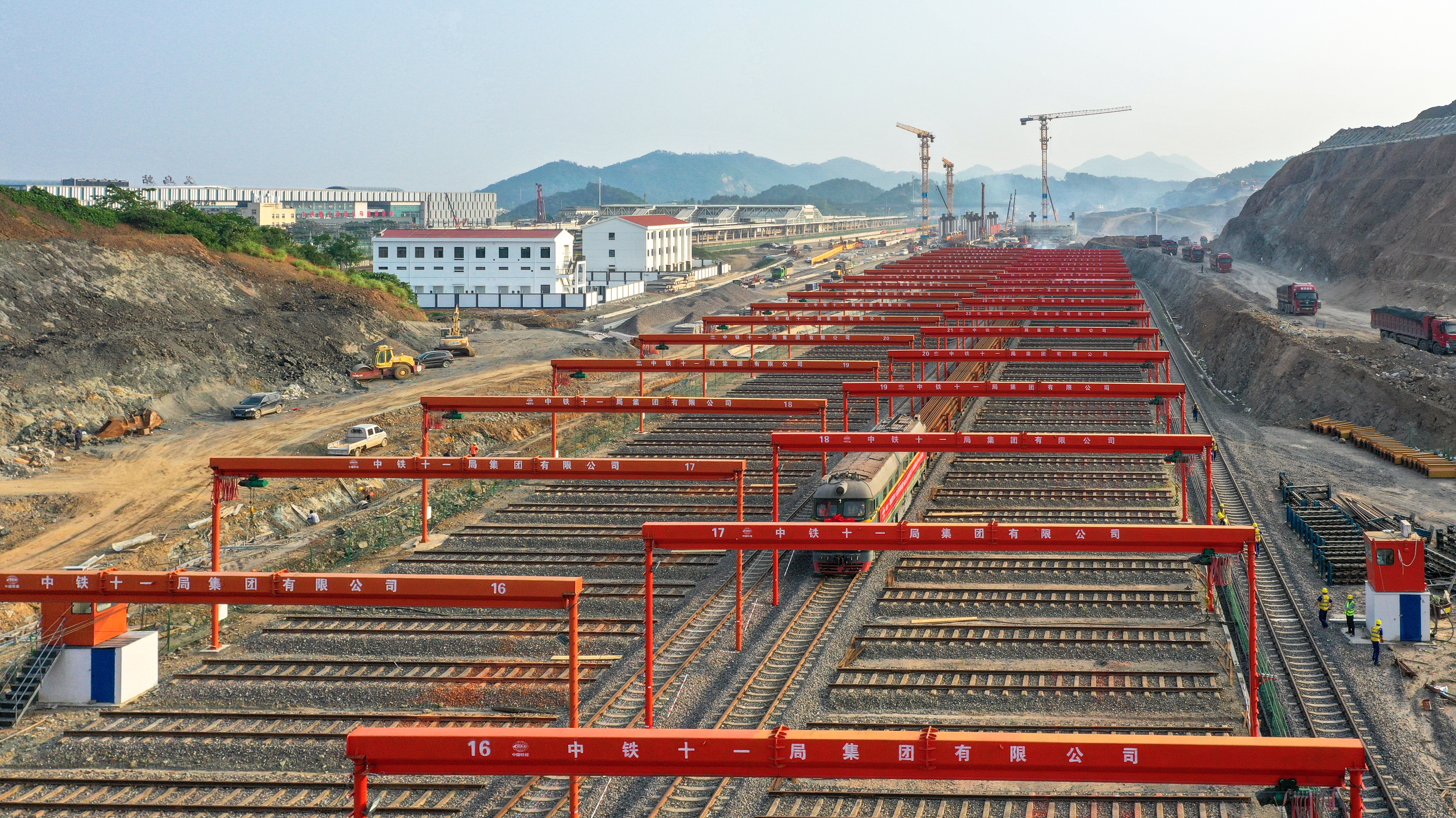 義烏鋪軌基地位于義烏高鐵站東北側(cè),占地約84畝,基地內(nèi)設(shè)有2個(gè)存軌區(qū),負(fù)責(zé)杭溫鐵路一期、二期長(zhǎng)軌存儲(chǔ)任務(wù),最大存軌量達(dá)400公里。由中鐵十一局集團(tuán)杭溫鐵路站前1標(biāo)項(xiàng)目經(jīng)理部承擔(dān)杭溫鐵路一期正線鋪軌414.827公里、站線鋪軌21.713公里的施工任務(wù)。