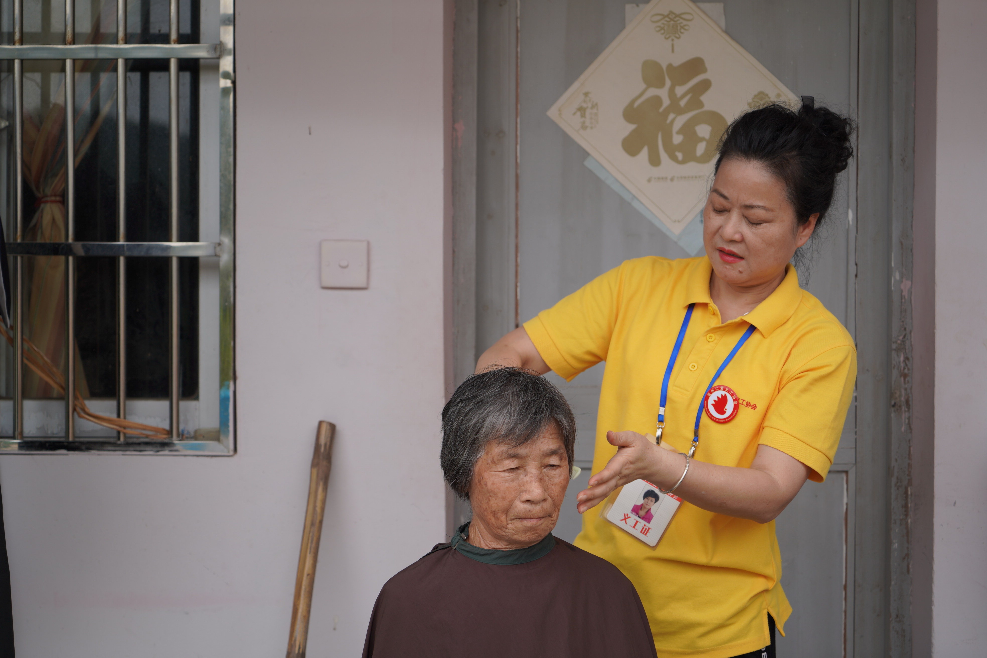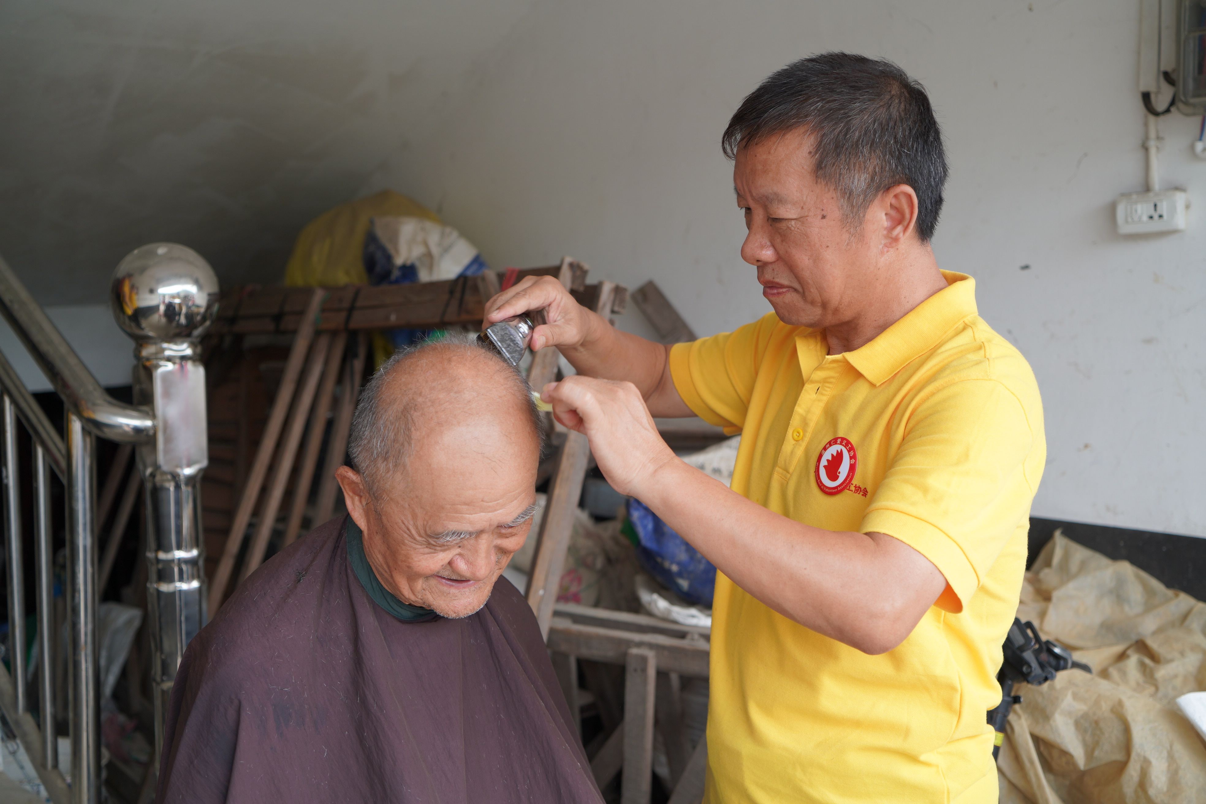 在愛心理發點,志愿者熟練、細心地為老人修理頭發,與老人嘮著家常,現場氛圍齊樂融融。