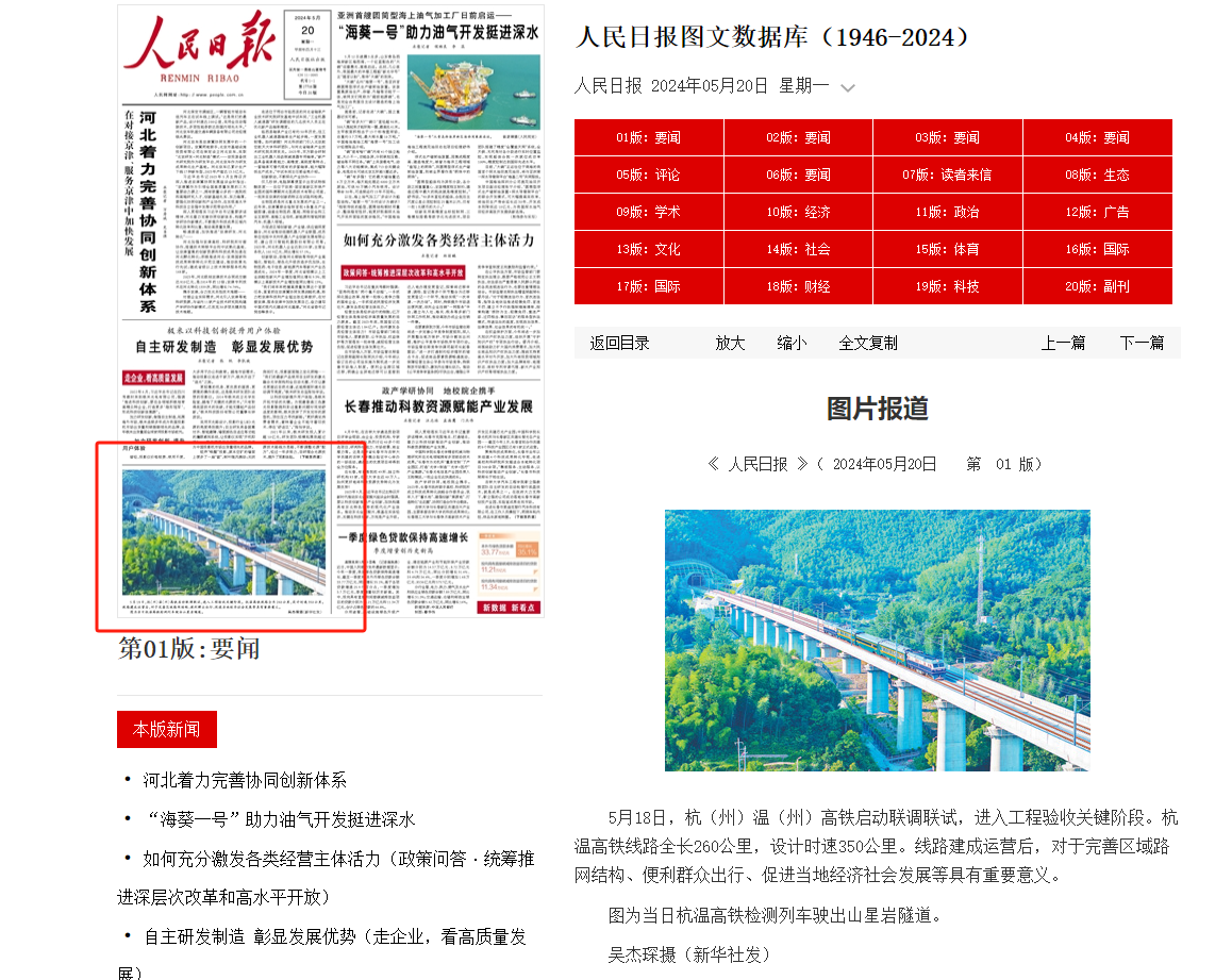 5月20日,《人民日報》頭版刊發圖片報道。報道指出,杭溫高鐵線路建成運營后,對于完善區域路網結構、便利群眾出行、促進當地經濟社會發展等具有重要意義。