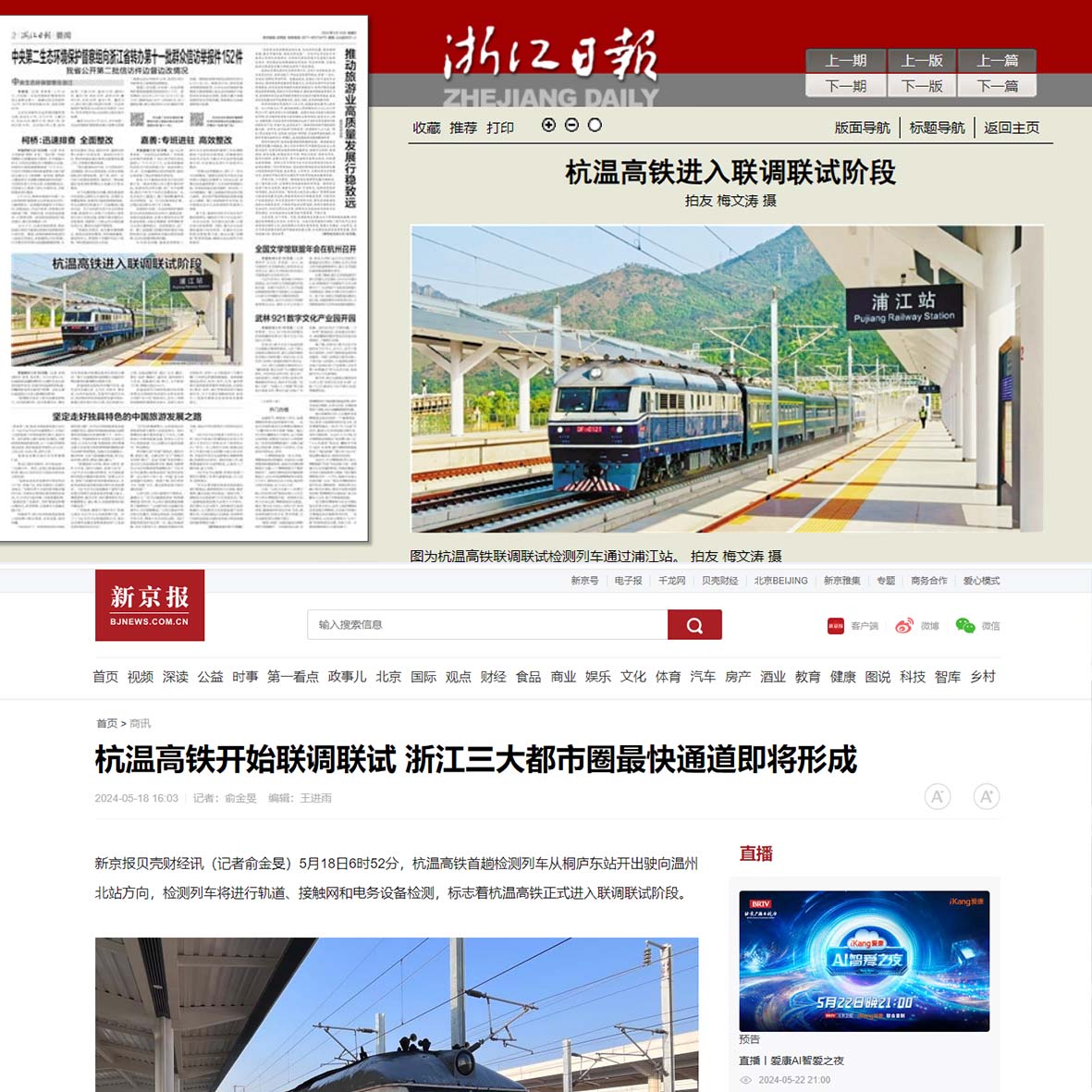5月18日,中央廣播電視總臺《新聞聯播》欄目播放報道《杭溫高鐵開始聯調聯試》。并指出,杭溫高鐵通車后,杭州、金華、溫州等地將形成一小時交通圈。