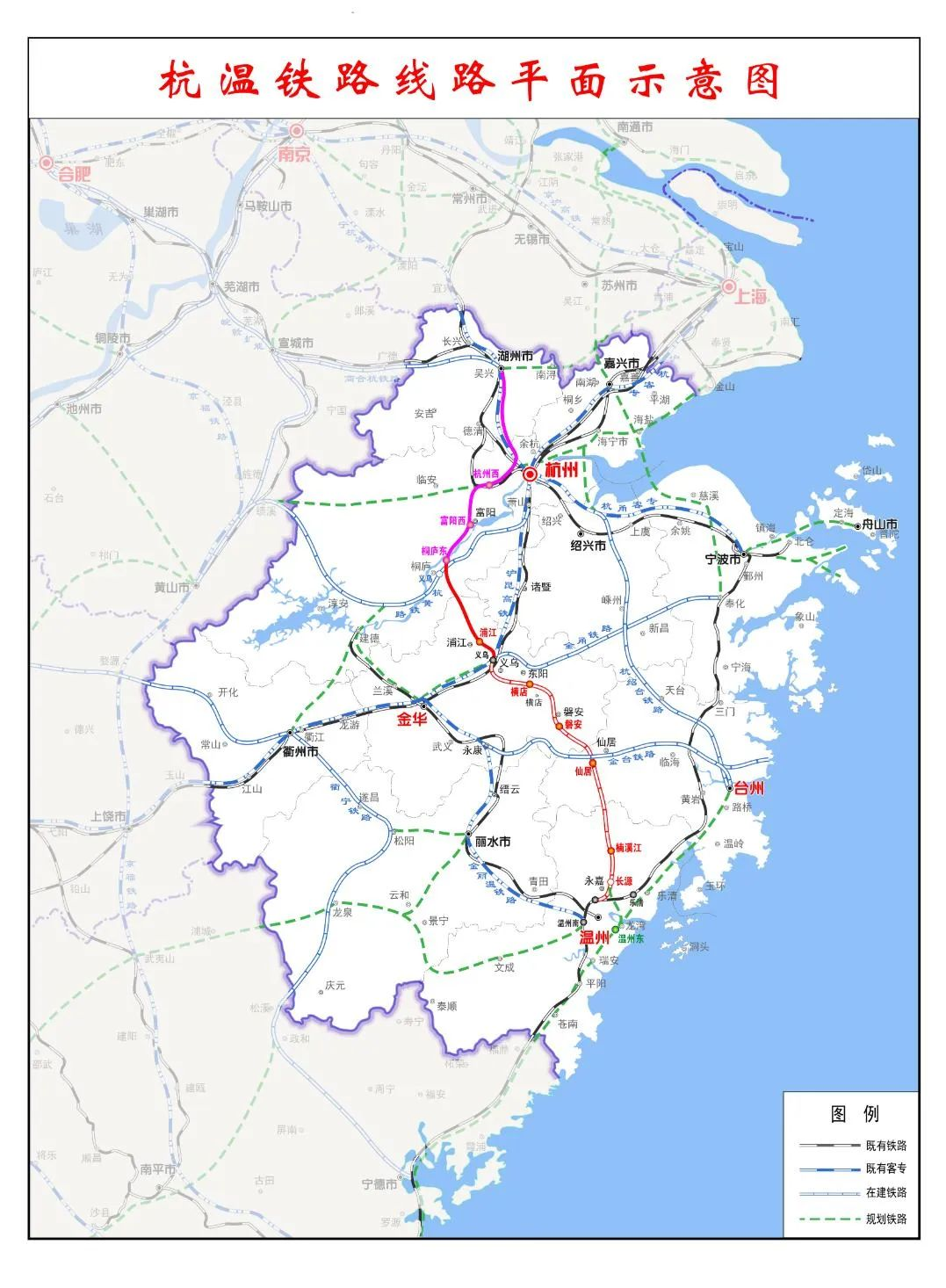 經杭州西站往北經湖州站接入寧杭高鐵,北上直達南京、濟南和北京等地,實現我國北向各個城市的輻射通達。
