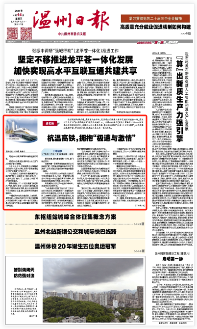 8月14日,溫州日報推出《提速!深融長三角——杭溫高鐵特別報道》欄目,看溫州如何以最佳面貌、最優狀態擁抱“全省1小時交通圈”,以交通圈拓展都市圈、帶動經濟圈,深度融入長三角一體化發展。以下為發布內容部分節選: