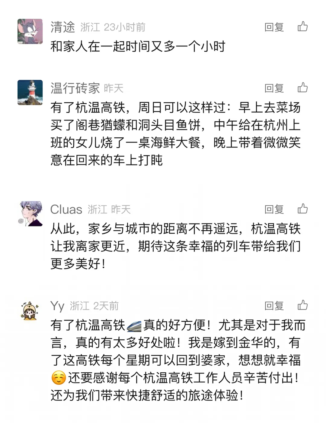 “有一條幸福的路叫回家的路。”回家速度更快了,與家人在一起時間更多了,幸福豈不是翻倍?許多網友留言表示,杭溫高鐵,圓了更快回家的夢,讓家與自己的聯系更加緊密,想回家了,隨時都可以回家看看。