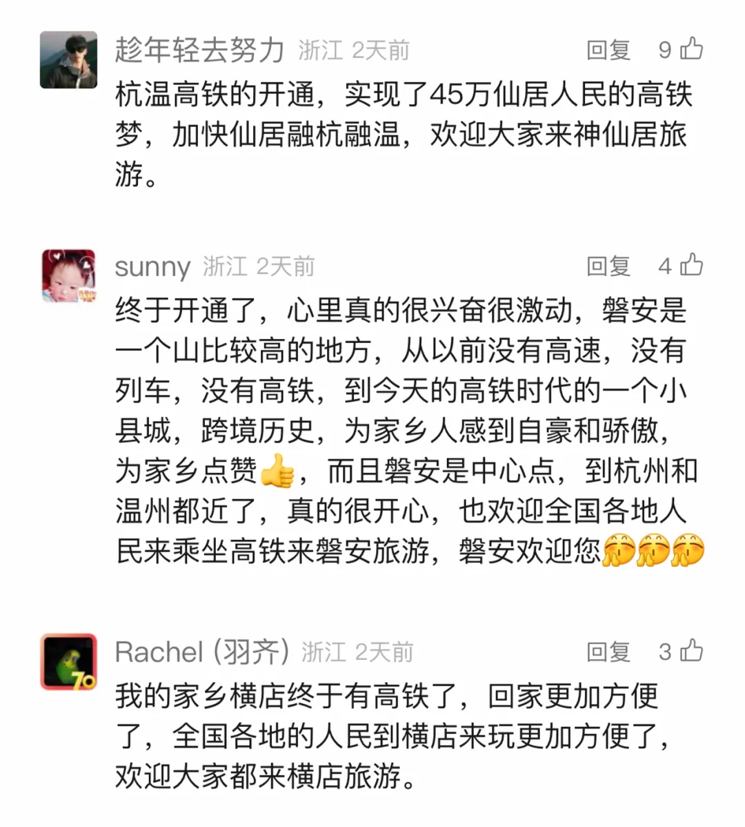 “要致富先修路。”時至今日,交通發展依舊是帶動一方經濟發展的有力舉措。杭溫高鐵不僅能帶動車站周邊區域發展,還將促進沿線城市與經濟發達地區的往來互動,實現產業優勢互補,推動各類資源要素暢通流動。特別是沿線仙居、磐安、東陽、浦江等地,將正式邁入高鐵時代,網友也通過留言,憧憬杭溫高鐵開通后家鄉發展的美好前景。