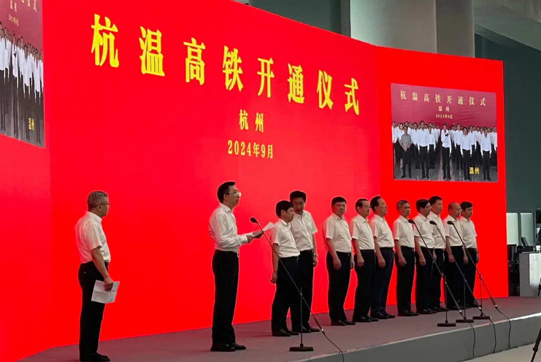 省委書記、省人大常委會主任易煉紅在省主會場出席通車儀式并宣布杭溫高鐵正式開通。省委副書記、省長王浩講話,國鐵集團黨組成員王立新致辭。省委副書記、杭州市委書記劉捷和省領導邱啟文、陳金彪、張振豐、尹學群出席,徐文光主持。中國鐵路上海局集團有限公司、杭溫高鐵社會資本投資建設方百盛聯合集團負責人介紹杭溫高鐵有關情況。通車儀式采用視頻連線方式舉行,省主會場設在鐵路杭州西站,浦江站、仙居站、溫州北站設分會場。