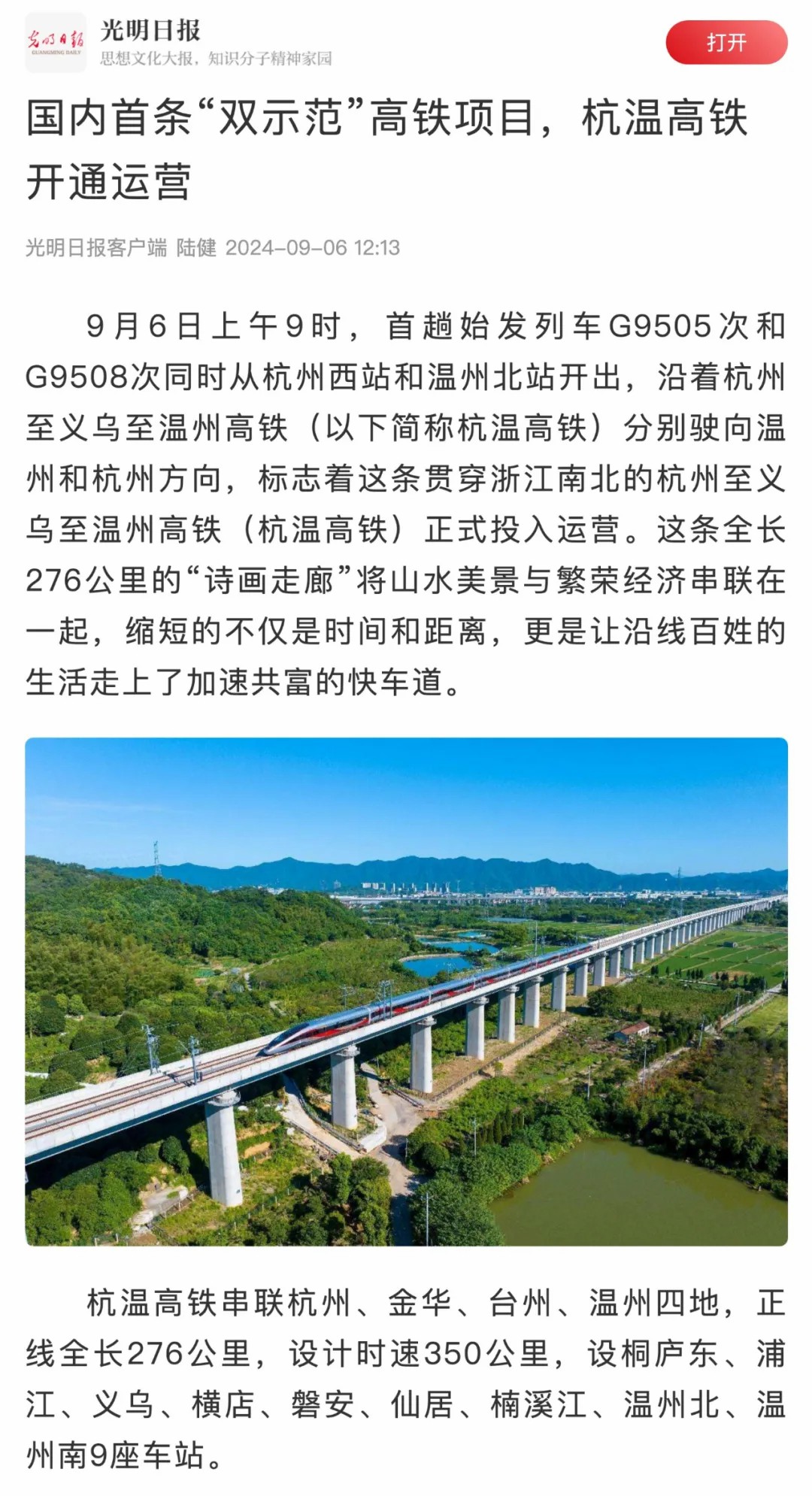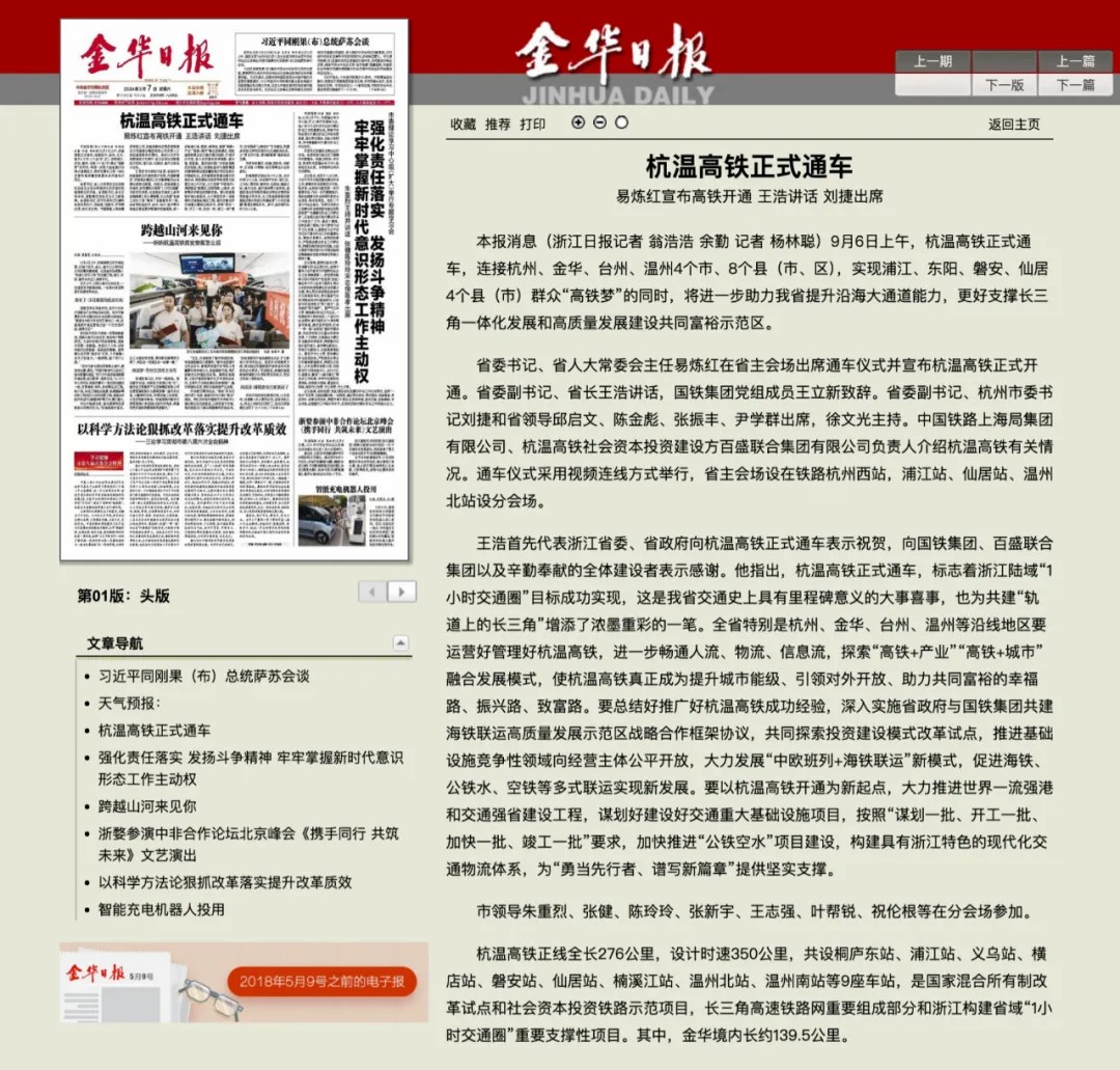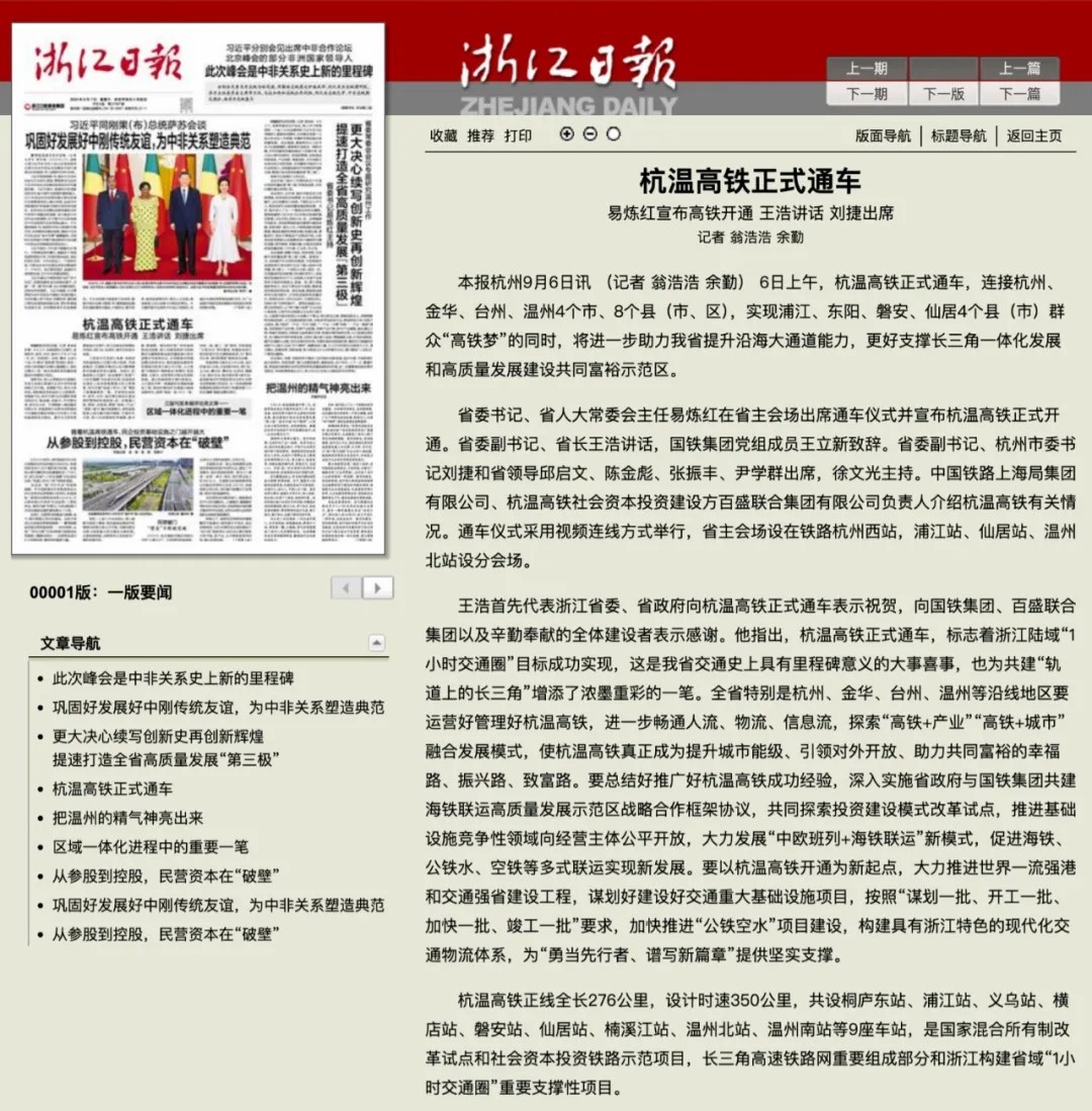 9月6日,隨著首趟始發(fā)列車G9505次和G9508次,同時從杭州西站和溫州北站開出,沿著杭溫高鐵分別駛向溫州和杭州方向,標志著由百盛聯(lián)合投資建設(shè)的杭溫高鐵正式開通運營。