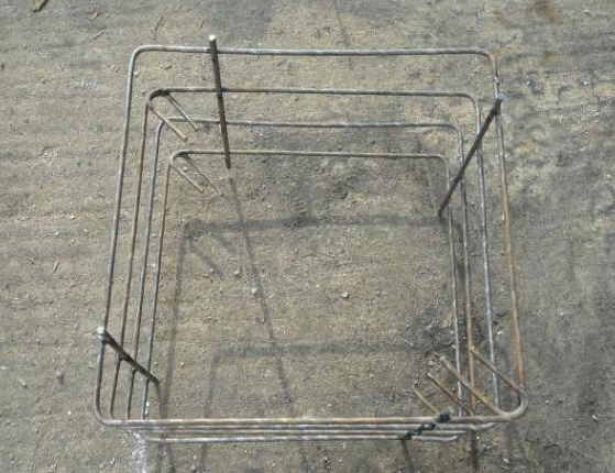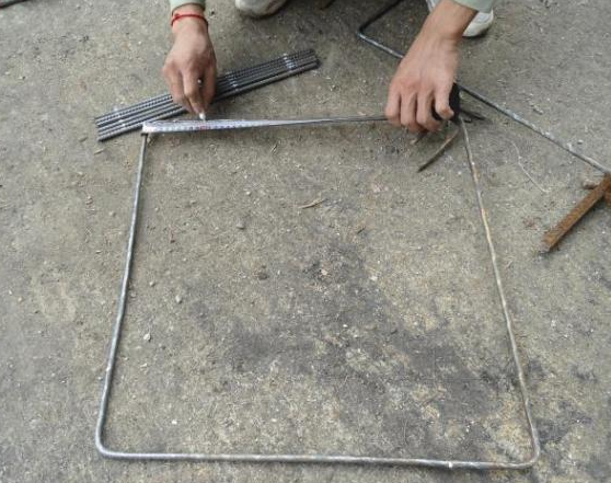 其次,根據圖紙設計要求,將縱向短筋與箍筋按間距、位置焊接,得到柱箍筋骨架鋼筋籠。